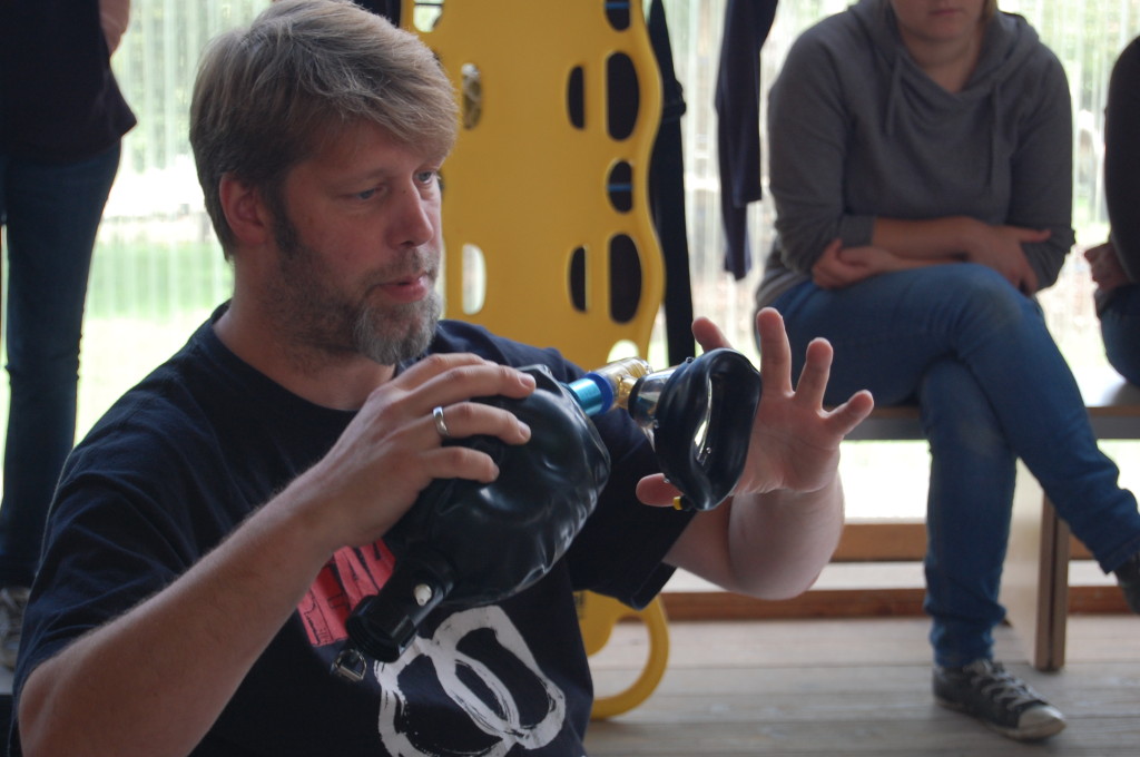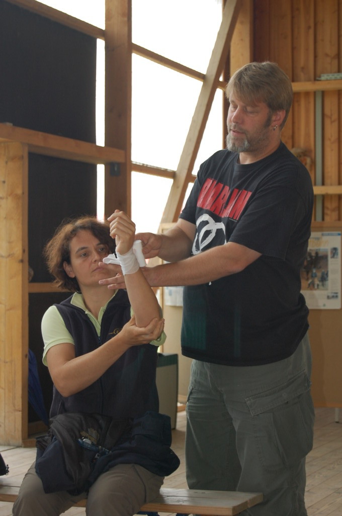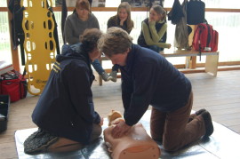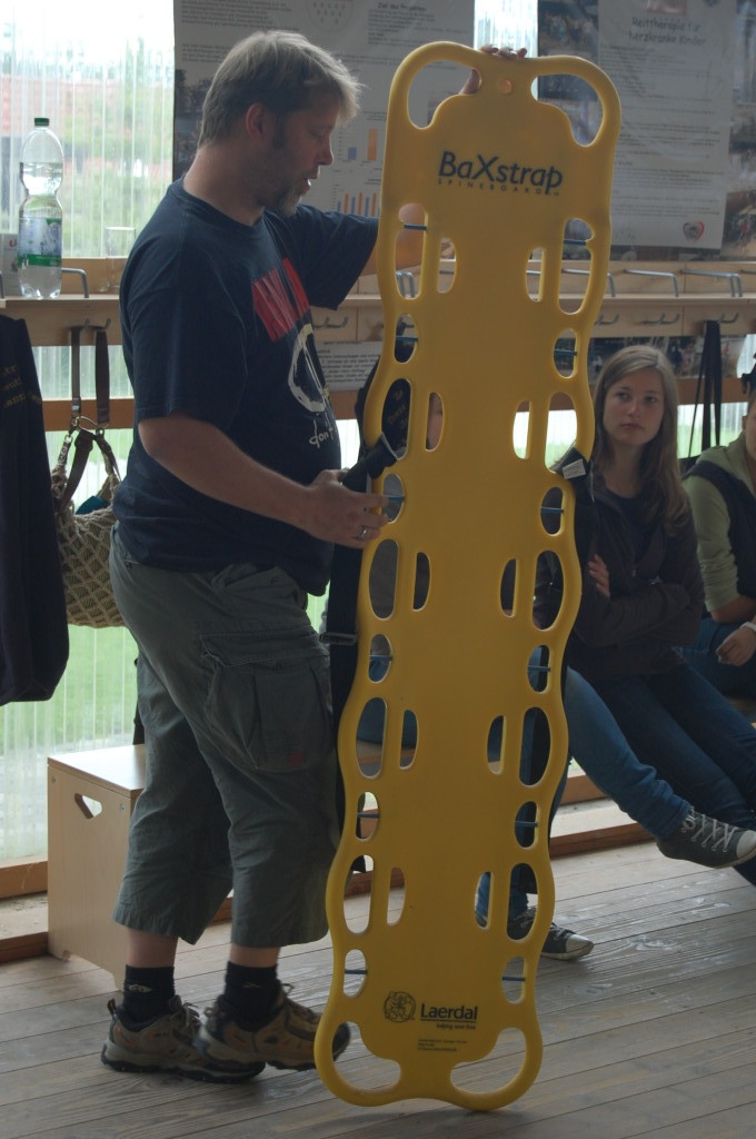 Bis dahin kümmert sich die Therapeutin des Notfallpatienten alleine um ihren Schützling. Sie untersucht ihn auf Verletzungen, redet beruhigend auf ihn ein und bringt ihn bei Bewusstlosigkeit in die stabile Seitenlage. Im schlimmsten Fall muss sie sofort Maßnahmen zur Wiederbelebung einleiten. „Aus diesem Grund hatten wir am Vormittag mit Unterstützung des Roten Kreuzes einen dreistündigen Erste-Hilfe-Fresh-Up-Kurs durchgeführt“, so Schickendantz. Rettungsassistent Holger Riedel vom Kreisverband Neuwied des DRK hatte bei dieser Gelegenheit bereits vorhandenes Wissen bei den Teilnehmern aufgefrischt. Vom Absetzen des Notrufs, der Stabilen Seitenlage über die Mund-zu-Mund-Beatmung bis hin zu Verbandstechniken reichten die Übungseinheiten für die Gruppe. Daneben berichtete der DRK-Helfer von den Neuerungen im Bereich der Ersten Hilfe und beantwortete alle ihm gestellten Zusatzfragen. Außerdem erhielten die Teilnehmer eine Einweisung in die Benutzung des vor Ort vorhandenen Rettungsrucksackes mit Defibrilator und des Spineboard (Rettungstrage).
