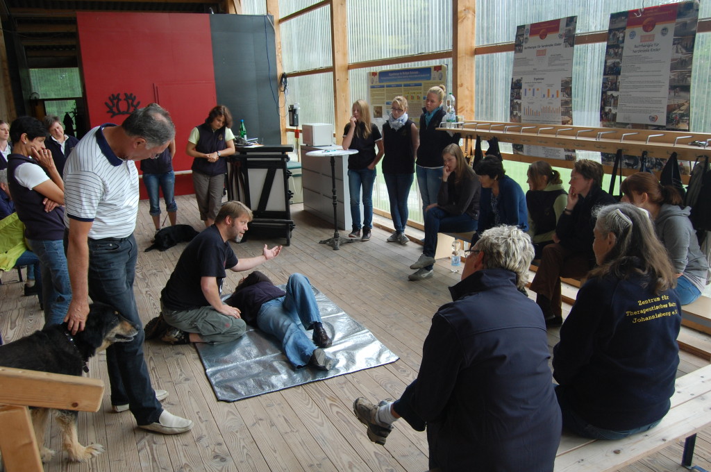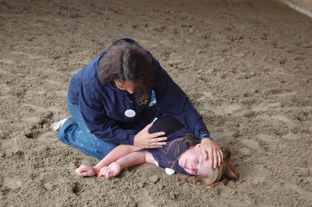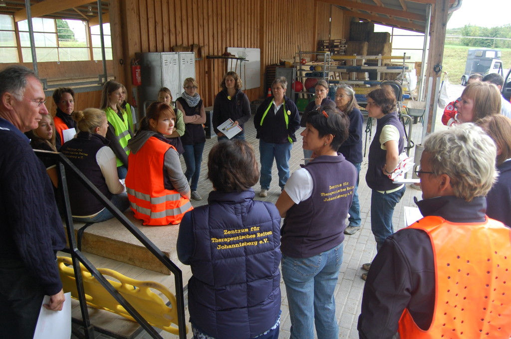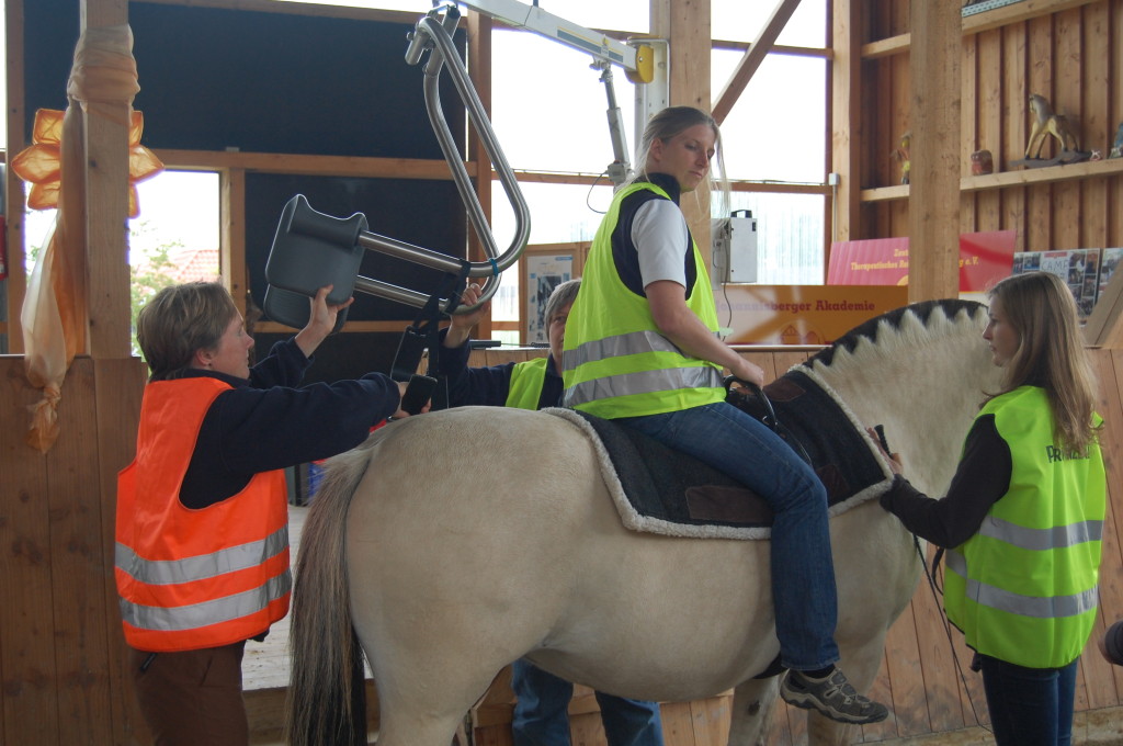 WINDHAGEN-JOHANNISBERG, 1. September 2011. Unter Anleitung der Kinderkardiologin Dr. Sabine Schickendantz von der Uni-Klinik Köln wird ein auf den ersten Blick recht einfach wirkendes Szenario durchgespielt. Während drei Patienten auf ihren Pferden mit jeweils einer Therapeutin und Pferdeführerin ihre Reittherapie absolvieren, erleidet ein Patient einen Krampfanfall, kann sich nicht mehr halten und rutscht vom Pferd. „Nun kommt es aber darauf an, kühlen Kopf zu bewahren, und die richtigen Schritte in der richtigen Reihenfolge zu tun“, erklärt die Ärztin. „Aufgeregtes Hin- und Herlaufen muss unbedingt vermieden werden. Jede Gruppe hat sich zunächst um ihren eigenen Patienten zu kümmern und dafür zu sorgen, dass die Pferde ruhig bleiben. Schließlich wollen wir keine zusätzlichen Verletzungen oder Unfälle durch scheuende Therapiepferde provozieren.“ An diese Vorgabe halten sich die Gruppen während der Übung. Der zweite Patient wird zur Rampe gebracht, wo er wie gewohnt vom Pferd absteigen kann. Der dritte wird entsprechend seiner hochgradigen Behinderung in einer anderen Ecke der Reithalle mit dem Lift vom Pferderücken gehoben. Auch das Pferd des Unfallopfers wird zunächst ruhigen Schrittes von der Pferdeführerin aus der Halle gesteuert. Erst wenn die übrigen Patienten in Sicherheit und alle Pferde in der Wartebox untergebracht sind, beginnen die Therapeutinnen und Pferdeführerinnen damit, dem Verunfallten und seiner Betreuerin zu helfen.