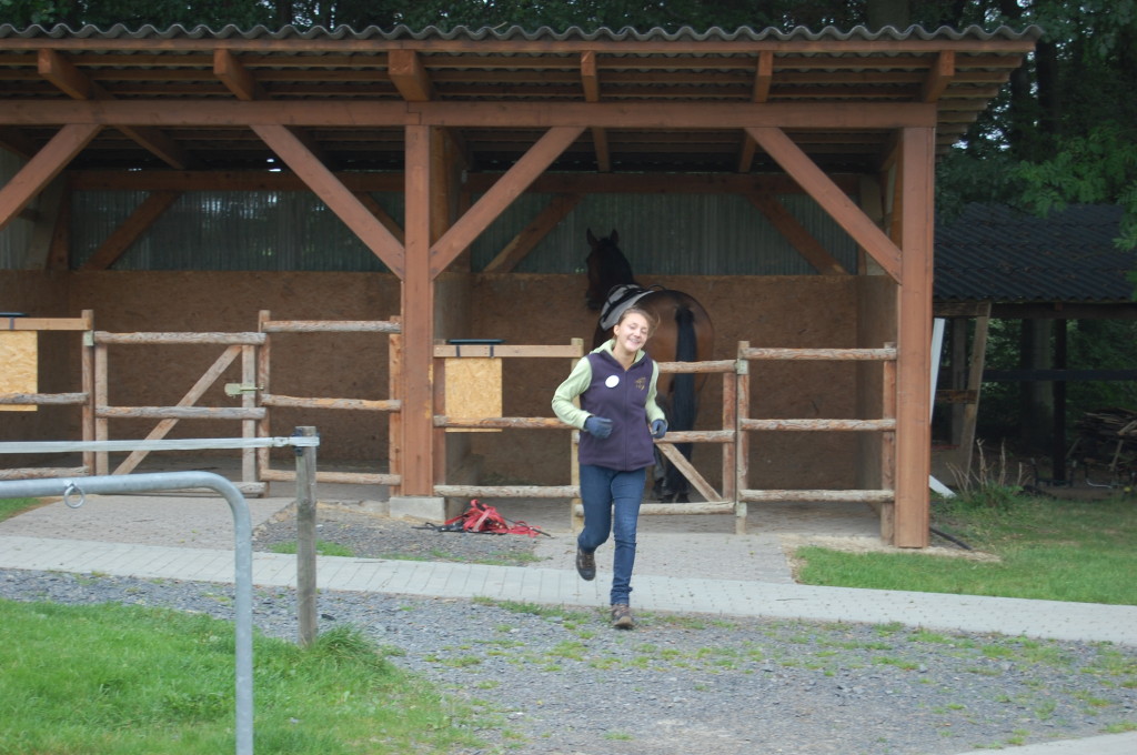 Im weiteren Verlauf der Nachmittags-Übung gilt es dann, die weiteren Abläufe durchzuspielen: Wer setzt den Notruf ab? Wer bringt die Notfall-Ausrüstung zum Patienten? Wer hält den Parkplatz für den Rettungswagen frei? Wer kümmert sich um anwesende Besucher oder Angehörige? Wer besorgt die Patientenakte für die Sanitäter? Wer holt die übrigen Pferde von der Koppel, falls ein Rettungshubschrauber landen muss? Die Dauer jeder Aktion wird von einem der zahlreichen eingeteilten Protokollanten auf die Sekunde genau gestoppt. In den nächsten Tagen werden diese Ergebnisse in den bestehenden Nothilfeplan eingearbeitet, der ständig aktualisiert wird.