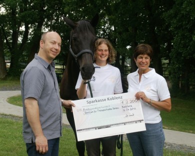 WINDHAGEN-JOHANNISBERG, 21. Juni 2011. Die Sportjugend Rheinland unterstützt das Zentrum für Therapeutisches Reiten Johannisberg e.V. mit 2.200 Euro aus den Mitteln der Sportjugend-Sammelaktion 2010. Geschäftsführerin Susanne Weber überreichte den Scheck gemeinsam mit dem stellvertretenden Vorsitzenden des Vorstandes der Sportjugend Rheinland, Jens Boettiger, auf der Reitanlage des gemeinnützigen Vereins in Windhagen-Johannisberg.