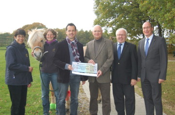 WINDHAGEN-JOHANNISBERG, 25. Oktober 2011. Dank der Unterstützung durch den Lions Club Rhein-Wied kann die vor einem Jahr gestartete Kooperation zwischen der Albert-Schweitzer-Schule (ASS), Schule mit dem Förderschwerpunkt Lernen in Asbach und dem Zentrum für Therapeutisches Reiten Johannisberg e.V. fortgesetzt werden. Heute überreichten Lions Club-Präsident Ingo Höltge, sein Amtsvorgänger Axel Schülzchen und der Vorsitzende des Lions-Fördervereines Hellmuth Buhr auf der Reitanlage des Therapiezentrums eine Spende über 8.400 Euro an Schulleiter Mario Litzenburger, der den Spendern dafür sehr herzlich dankte. Bei der Spende handelt es sich um den Erlös des im März 2011 vom Lions Club Rhein-Wied veranstalteten Balls. Mit dem Geld finanziert die Schule ein Jahr lang die Heilpädagogische Förderung mit dem Pferd für eine Gruppe von acht Kindern im Alter von sechs bis zehn Jahren.
